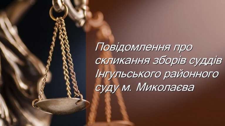 Відповідно до п.3.1, п.3.3 Положення про збори суддів Інгульського районного суду м. Миколаєва повідомляю, що 11.02.2026 року о 12:00 відбудуться збори суддів Інгульського районного суду м. Миколаєва, в приміщені суду за адресою м. Миколаїв вул. Космонавтів, 81/16
